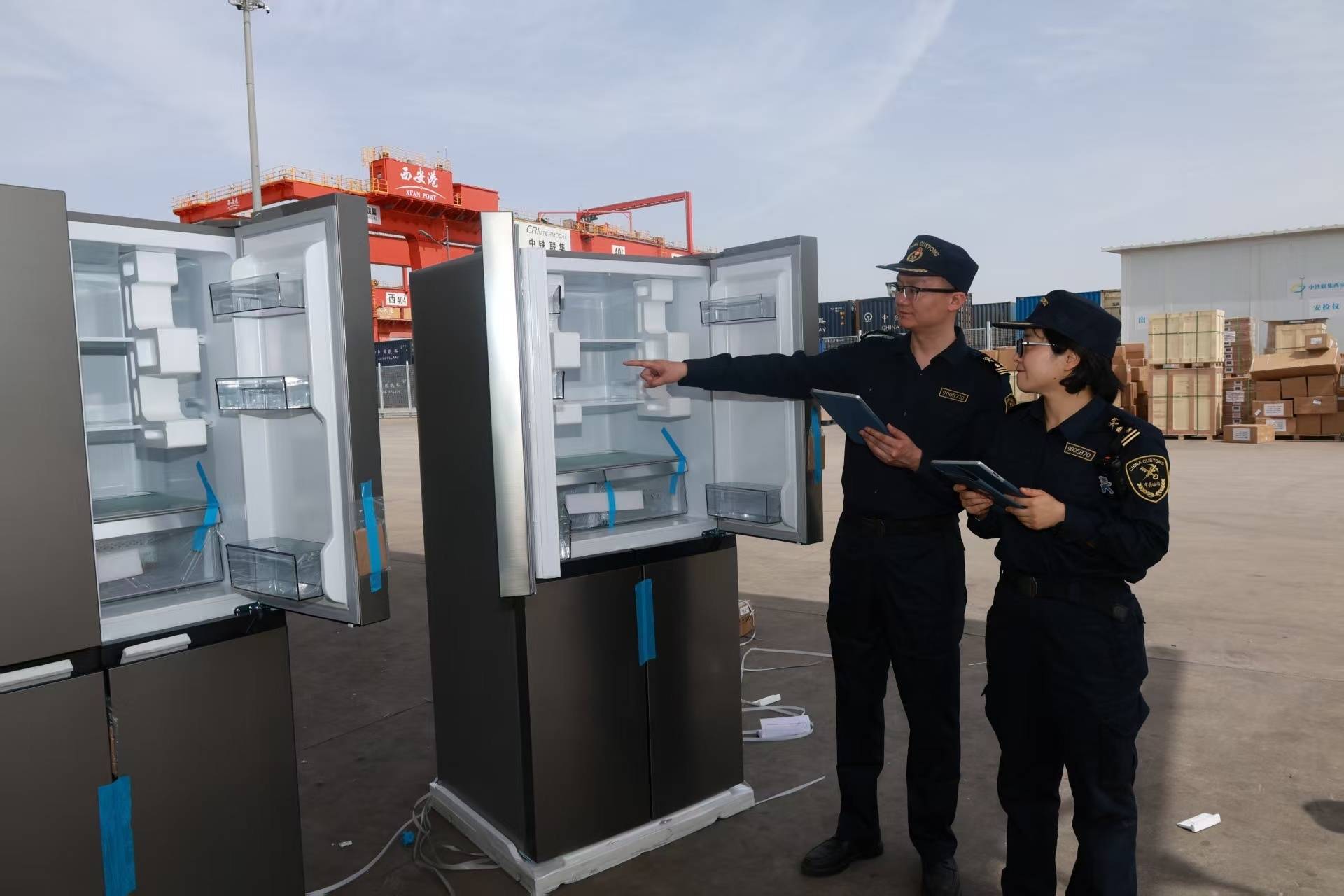 2025年10月,西安海关所属西安车站海关关员对经中欧班列(西安)出口的白色家电进行现场监管。受访者供图